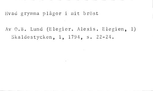 Hvad grymma plågor i mit bröst //// Av O.B. Lund (Elegier. Alexis. Elegien, 1) Skaldestycken, 1, 1794, s. 22-24.