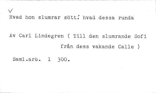 v //// Hvad hon slumrar sött: hvad dessa runda //// Av Carl Lindegren ( Till den slumrande Sofi från dess vakande Calle ) //// Saml.arb. I 300.