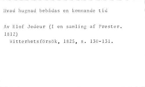 Hvad hugnad bebådas en kommande tid //// Av Elof Jedeur (I en samling af Prester. 1812) //// Witterhetsförsök, 1825, s. 130-131.