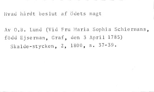 Hvad hårdt beslut af Ödets magt //// Av O.B. Lund (Vid Fru Maria Sophia Schiermans, född Ejserman, Graf, den 3 April 1785) Skalde-stycken, 2, 1800, s. 37-39.