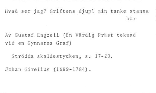 Ilvad ser jag? Griftens djup: min tanke stanna //// här //// Av Gustaf Engzell (En Värdig Präst teknad vid en Gynnares Graf) //// Strödda skaldestycken, s. 17-20. Johan Girelius (1699-1784).