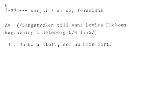 V //// Hwad --- sörja? / Wi dö, förswinna //// Av (/Sångstycken till Anna Lovisa Ekeboms begravning i Göteborg 6/4 1775/) //// Jfr Du kära stoft, som nu bärs bort.