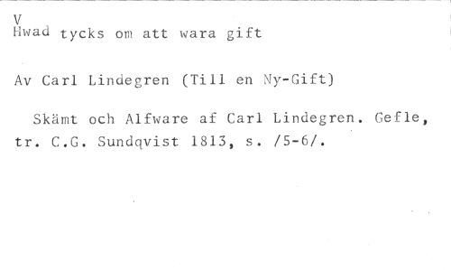 V //// Hivad tycks om att wara gift //// Av Carl Lindegren (Till en Ny-Gift) //// Skämt och Alfware af Carl Lindegren. Gefle, //// tr. C.G. Sundqvist 1813, s. /5-6/. •