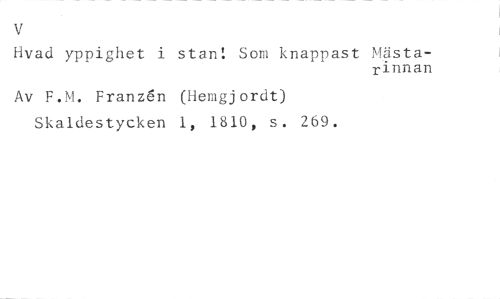 V //// Hvad yppighet i stan! Som knappast Mästa- //// rinnan //// Av F.M. Franzén (Hemgjordt) Skaldestycken 1, 1810, s. 269.