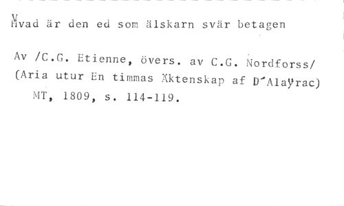 Evad är den ed som älskarn svär betagen //// Av /C.G. Etienne, övers. av C.G. Nordforss/ (Aria utur En timmas Äktenskap af D'Alayrac) MT, 1809, s. 114-119.