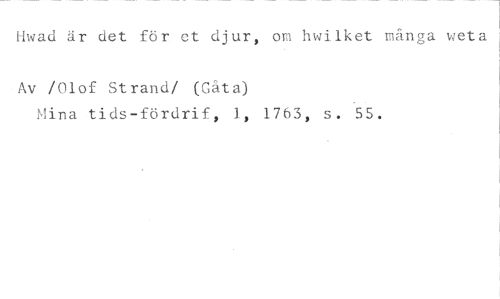 Hwad är det för et djur, om hwilket många weta //// Av /Olof Strand/ (Gåta) //// Mina tids-fördrif, 1, 1763, s. 55.