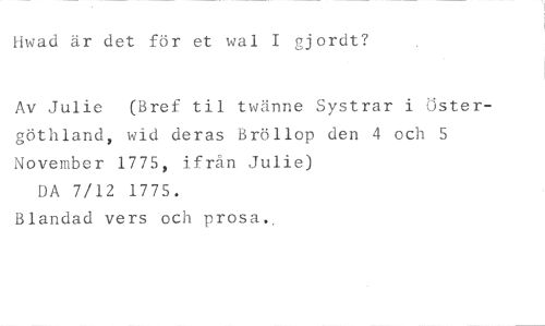 Hwad är det för et wal I gjordt? //// Av Julie (Bref til twänne Systrar i Östergöthland, wid deras Bröllop den 4 och 5 November 1775, ifrån Julie) //// DA 7/12 1775. //// Blandad vers och prosa.,