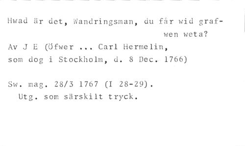 Hwad är det, Wandringsman, du får wid graf- //// wen weta? //// Av J E (öfwer Carl Hermelin, //// som dog i Stockholm, d. 8 Dec.. 1766) //// Sw. mag. 28/3 1767 (I 28-29). Utg. som särskilt tryck.