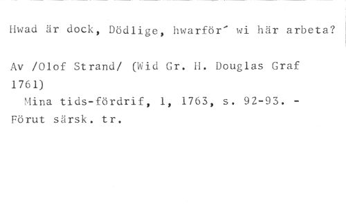 Hwad är dock, Dödlige, hwarför' wi här arbeta? //// Av /Olof Strand/ (Wid Gr. H. Douglas Graf 1761) //// Mina tids-fördrif, 1, 1763, s. 92-93. Förut särsk. tr.