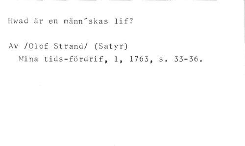 Hwad är en männ-skas 1if? //// Av /Olof Strand/ (Satyr) //// Mina tids-fördrif, 1, 1763, s. 33-36.