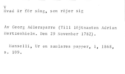 kvad är för sång, som röjer sig //// Av Georg Adlersparre (Till löjtnanten Adrian hertzenhielm. Den 29 November 1782). //// hanselli, Ur en samlares papper, 1, 1868, s. 109.