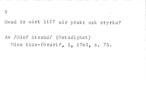 V //// Hwad är wårt lif? wår prakt ock styrka? //// Av /Olof Strand/ (Ostadighet) //// Mina tids-fördrif, 1, 1763, s. 73.