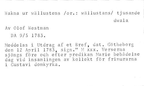 :rakna ur wällustens /or.: wällustans/ tjusande //// dwala. //// Av Olof Westman DA 9/5 1783. //// Meddelas i Utdrag af et Bref, dat. Götheborg den 12 April 1783, sign." M xxx. Verserna sjöngs före och efter predikan Marie bebådelse dag vid insamlingen av kollekt för frimurarna i Gustavi domkyrka.