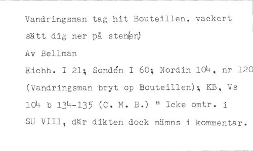 Vandringsman tag hit Bouteillen, vackert sätt dig ner på sten(en) //// Av Bellman //// Eichh. 121; Sonden 160; Nordin 104, nr 120 (Vandringsman bryt op Bouteillen); KB, Vs 104 b 134-135 (C. M. B.) " Icke omtr. //// SU VIII, där dikten dock nämns i kommentar.