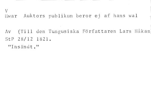 V //// Hwar Auktors publikum beror ej af hans wal //// Av (Till den Tungusiska Författaren Lars Håkan: StP 28/12 1821. //// "Insåndt."