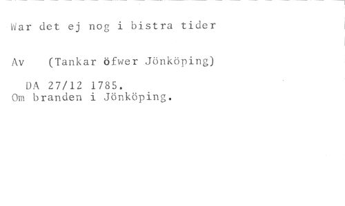 War det ej nog i bistra tider //// Av (Tankar öfwer Jönköping) //// DA 27/12 1785. //// Om branden i Jönköping.