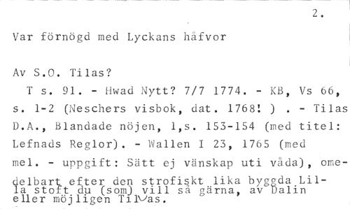 2. //// Var förnögd med Lyckans håfvor //// Av S.O. Tilas? //// T s. 91. - Hwad Nytt? 7/7 1774. - KB, Vs 66, s. 1-2 (Neschers visbok, dat. 1768! ) . - Tilas D.A., Blandade nöjen, 1,s. 153-154 (med titel: Lefnads Reglor). - Wallen I 23, 1765 (med mel. - uppgift: Sätt ej vänskap uti våda), ome- //// delbart efter den strofiskt_lika byggda.Lilla stoft du (som) vill sa gärna, av Dalin eller möjligen Til\Yas.