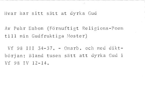 livar ilar sitt sätt at dyrka Gud //// Av Pehr Enbom (Förnuftigt Religions-Poem till min Gudfruktiga Moster) //// Vf 98 III 34-37. - Omarb. och med diktbörjan: Bland tusen sätt att dyrka Gud i Vf 98 IV 12-14.