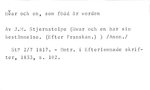 Horar och en, som född är worden //// Av J.M. Stjernstolpe (Hwar och en har sin bestämmelse. (Efter Franskan.) ) /Anon. //// /StP 2/7 1817. - Omtr. i Efterlemnade skrifter, 1833, s. 102.