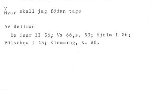 Vvar skall jag födan taga li //// Av Bellman //// De Geer II 56; Vs 66,s. 53; Hjelm I 86; Völschow I 43; Klemming, s. 90.