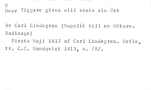V //// Hwar Tiggare gärna will steka sin Ost //// Av Carl Lindegren (Supplik till en Hökare. Badinage) //// Första Maji 1813 af Carl Lindegren. Gefle, tr. C.G. Sundqvist 1813, s. /8/.