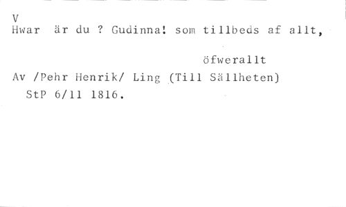 V //// Hwar är du ? Gudinna! som tillbeds af allt, • //// öfwerallt //// Av /Pehr Henrik/ Ling (Till Sällheten) StP 6/11 1816.