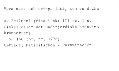 Vara nätt och trippa lätt, som en docka //// Av Bellman? (Visa i akt III sc. 1 av Finkel eller Det underjordiska bränvinsbränneriet) //// SS 160 (or. tr. 1776). //// Omkväde: Pitimitschen - Paramitschen.
