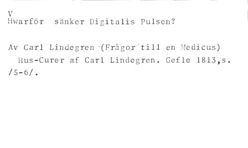 V //// Hwarför sänker Digitalis Pulsen? //// Av Carl Lindegren -(Frågor' till en Medicus) Hus-Curer af Carl Lindegren. Gefle 1813,s. /5-6/.