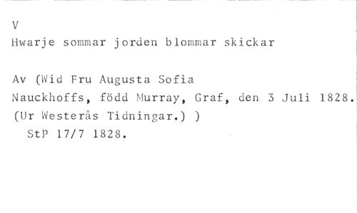 v //// Hwarie sommar jorden blommar skickar //// Av (Wid Fru Augusta Sofia //// Nauckhoffs, född Murray, Graf, den 3 Juli 1828. (Ur Westerås Tidningar.) ) StP 17/7 1828.