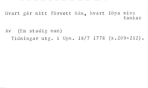 Yvart går mitt förvett hän, hvart löpa mina //// tankar //// Av (En stadig man) //// Tidningar utg. i Ups. 18/7 1778 (s.209-212).