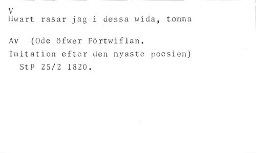 [Iwart rasar jag i dessa wida, tomma //// Av (Ode öfwer Förtwiflan. //// Imitation efter den nyaste poesien) StP 25/2 1820.