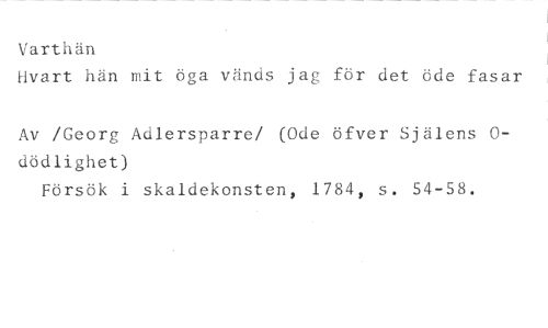 Varthän //// Ilvart hän mit öga vänds jag för det öde fasar //// Av /Georg Adlersparre/ (Ode öfver Själens Odödlighet) //// Försök i skaldekonsten, 1784, s. 54-58.