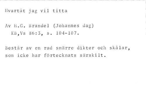 Hvartät jag vii titta //// Av H.G. Brandel (Johannes dag) KB,Vs 86:3, s. 104-107. //// Består av en rad smärre dikter och skålar, som icke har förtecknats särskilt.