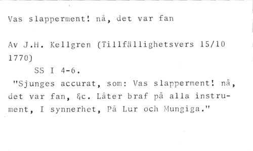 Vas slapperment! nå, det var fan //// Av J.H. Kellgren (Tillfällighetsvers 15/10 1770) //// SS I 4-6. //// "Sjunges accurat, som: Vas slapperment! nå, det var fan, k. Låter braf på alla instrument, I synnerhet, På Lur och Mungiga."