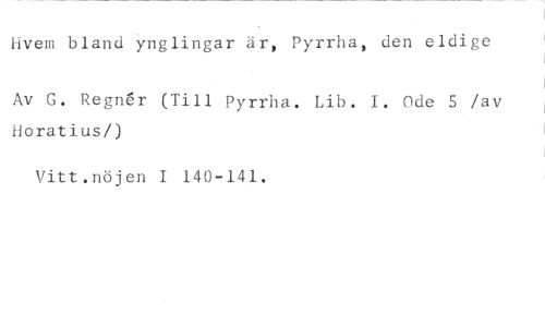 Hvem bland Ynglingar är, Pyrrha, den eldige //// Av G. Regnet' (Till Pyrrha. Lib. I. Ode 5 /av Horatius/) //// Vitt.nöjen I 140-141.
