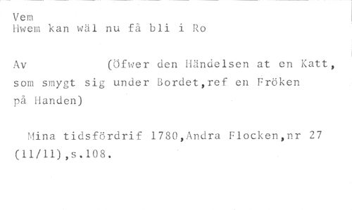 Vem //// Hwem kan wäl nu få bli i Ro //// Av (Öfwer den Händelsen at en Katt, //// som smygt sig under Bordet,ref en Fröken på Handen) //// Mina tidsfördrif 1780,Andra Flocken,nr 27 (11/11),s.1°8.