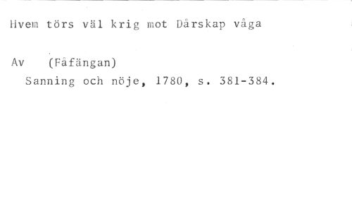Hvem törs väl krig mot Dårskap våga //// Av (Fåfängan) //// Sanning och nöje, 1780, s. 381-384.