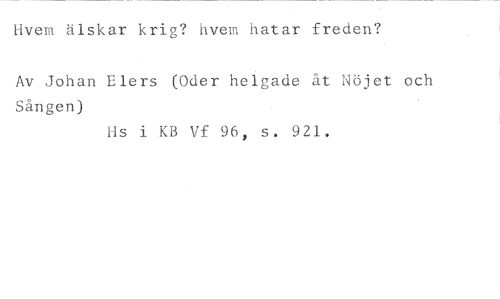 Hvem älskar krig? hvem hatar freden? //// Av Johan Elers (Oder helgade åt Nöjet och Sången) //// Hs i K3 \Tf 96, s. 921.