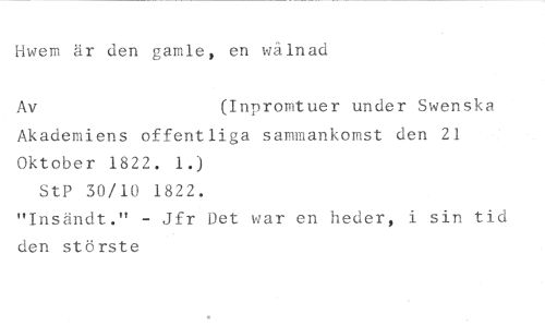 Hwem är den gamle, en wälnad //// Av (Inpromtuer under Swenska //// Akademiens offentliga sammankomst den 21 Oktober 1822. 1.) //// StP 30/10 1822. //// "Insändt." - Jfr Det war en heder, i sin tid den störste