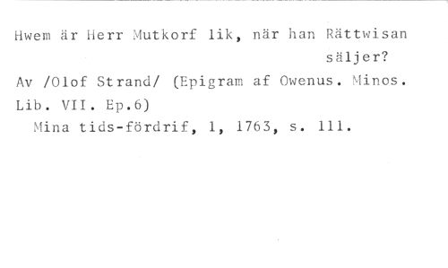 Hwem är Herr Mutkorf lik, när han Rättwisan //// säljer? //// Av /Olof Strand/ (Epigram af Owenus. Minos. Lib. VII. Ep.6) //// Mina tids-fördrif, 1, 1763, s. 111.