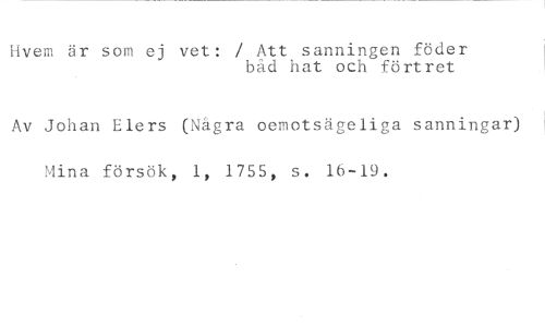 Hvem är som ej vet: / Att sanningen föder //// båd hat och förtret //// Av Johan Elers (Några oemotsägeliga sanningar) Mina försök, 1, 1755, s. 16-19.