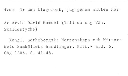 Hvems är den klagoröst, jag genom natten hör //// Av Arvid David Hummel (Till en ung Vän. Skaldestycke) //// Kongl. Götheborgska Wettenskaps och Witterhets Samhällets handlingar. Witt.- afd. 5. Gbg 1806. S. 41-48.