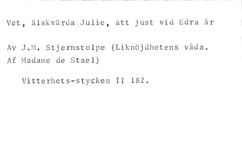 Vet, älskvärda Julie, att just vid Edra är //// Av J.M. Stjernstolpe (Liknöjdhetens våda. Af Madame de Stael) //// Vitterhets-stycken II 182.