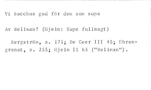Vi Bacchus gud för dem som supa //// Av Bellman? (Hjelm: Supe fullmagt) //// Bergström, s. 171; De Geer III 45; Enren-granat, s. 255; Hjelm II 63 ("Bellman").