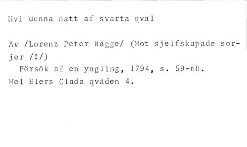 Hvi uenna natt af svarta oval //// Av /Lorenz Peter Bagge/ (Mot sjelfskapade sor- //// jer /!/) //// Försök af en yngling, 1794, s. 59-60. Mel Elers Glada qväden 4.