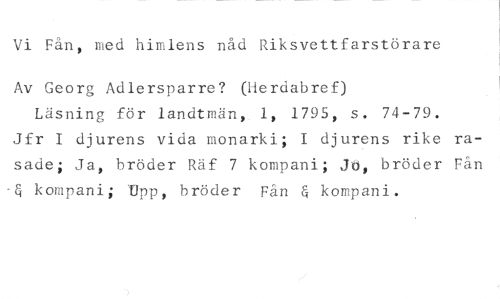 Vi Fån, med himlens nåd Riksvettfarstörare //// Av Georg Adlersparre? (Herdabref) //// Läsning för landtmän, 1, 1795, s. 74-79. //// Jfr I djurens vida monarki; I djurens rike rasade; Ja, bröder Räf 7 kompani; Jö, bröder Fån -& kompani; Upp, bröder Fån & kompani.