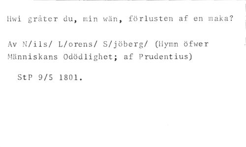 Hwi gråter du, min wän, förlusten af en maka? //// Av N/ils/ L/orens/ S/jöberg/ (Hymn öfwer Människans Odödlighet; af Prudentius) //// StP 915 1801.