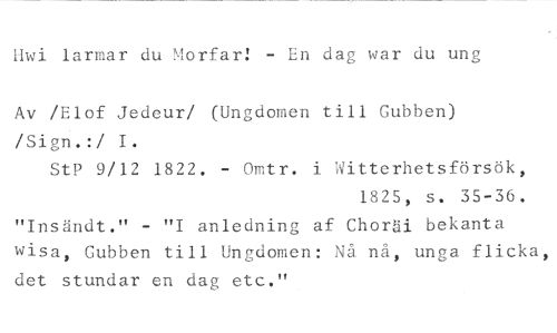 Hwi larmar du Morfar! - En dag war du ung //// Av /Elof Jedeur/ (Ungdomen till Gubben) /Sign.:/ I. //// StP 9/12 1822. - Omtr. i bitterhetsförsök, //// 1825, s. 35-36. //// "Insändt." - "I anledning af Choråi bekanta Ovisa, Gubben till Ungdomen: Nå nå, unga flicka, det stundar en dag etc."