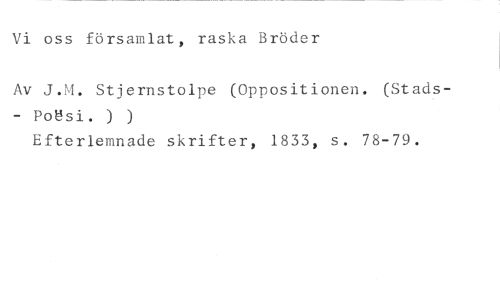 Vi oss församlat, raska Bröder //// Av J.A. Stiernstolpe (Oppositionen. (Stads- Po9si. ) ) //// Efterlemnade skrifter, 1833, s. 78-79.