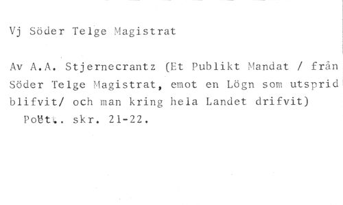 Vj Söder Telge Magistrat //// Av A.A. Stjernecrantz (Et Publikt Mandat / från Söder Telge Magistrat, emot en Lögn som utspridd blifvit/ och man kring hela Landet drifvit) Patt.. skr. 21-22.